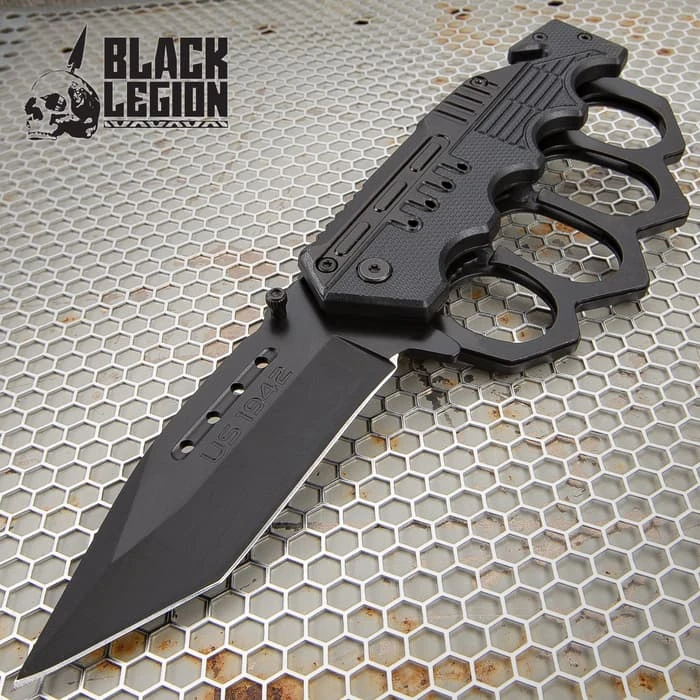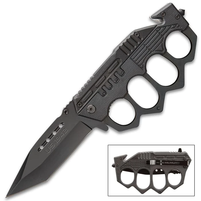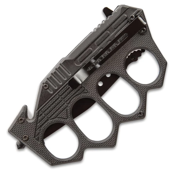 Black Folding Knuckle Knife – Stainless Steel Blade, ABS Handle, Seatbelt Cutter, Glass Breaker – Closed Length 5 1/4”