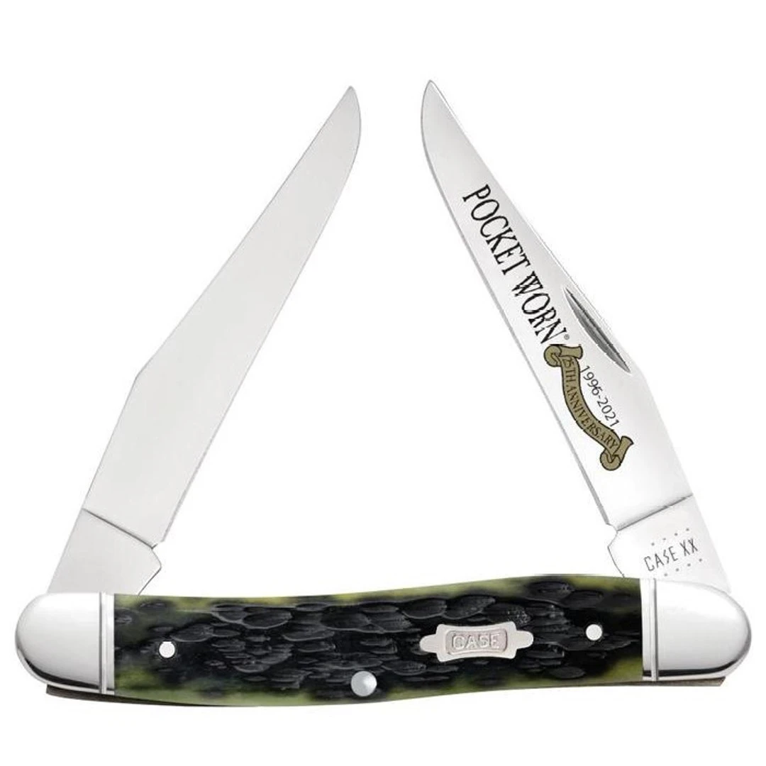 The Case Pocket Worn Olive Green Bone Peach Seed Jig Muskrat Knife is a capable knife featuring two versatile clip blades. The clip blade is extremely versatile, with a sharp point for piercing and a shape that allows for better control over the cutting edge. This knife is great for everyday chores at work or around the house. Paired with the beautiful olive green bone of the handle, this knife is an excellent addition to any everyday carry.Â