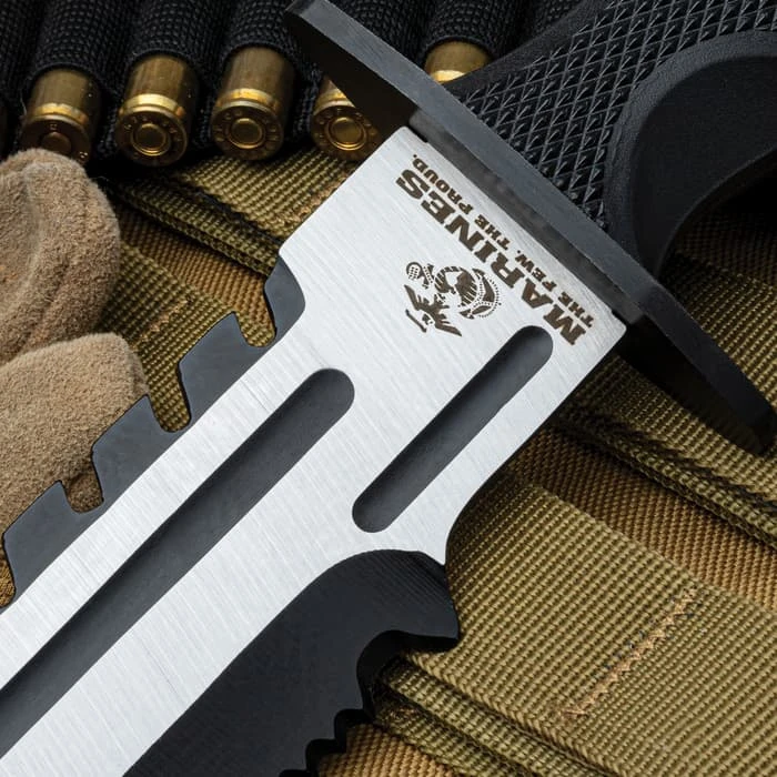 USMC Operation Mako Knife With Sheath – Stainless Steel Blade, Full-Tang, Grippy TPU Handle Scales, Sawback – Length 16 1/2”